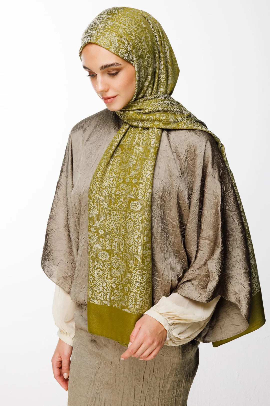 Henna Desen Çift Taraflı Şal Yağ Yeşili - Ekru