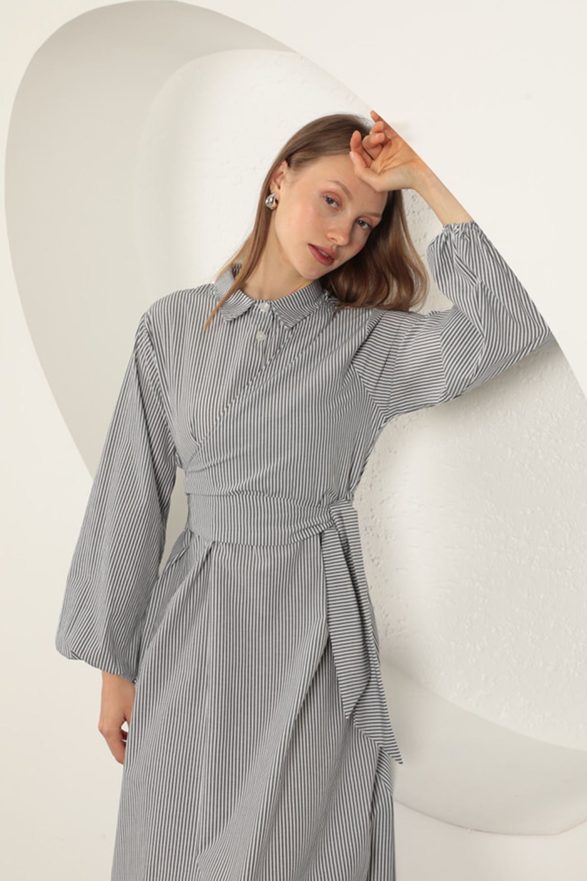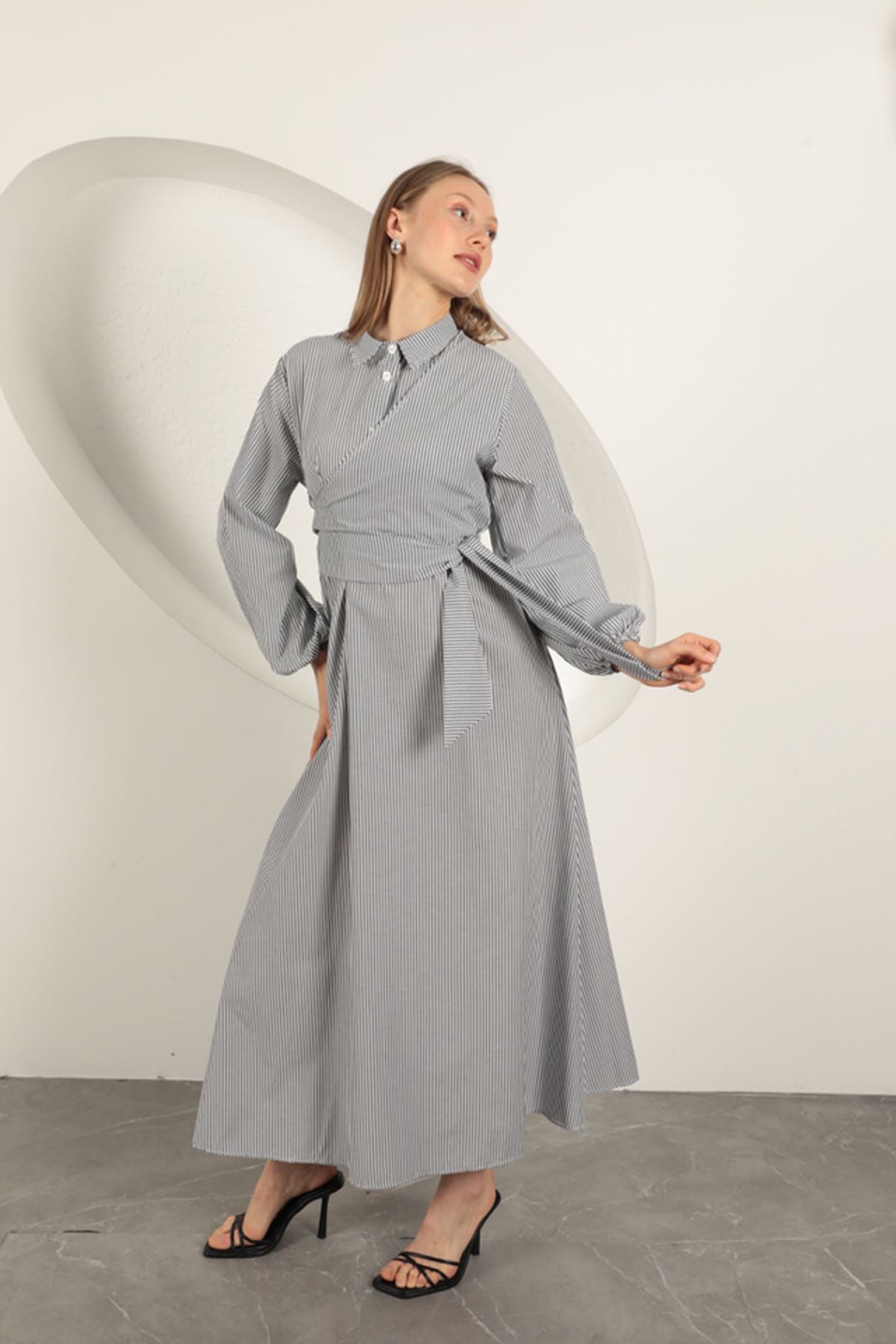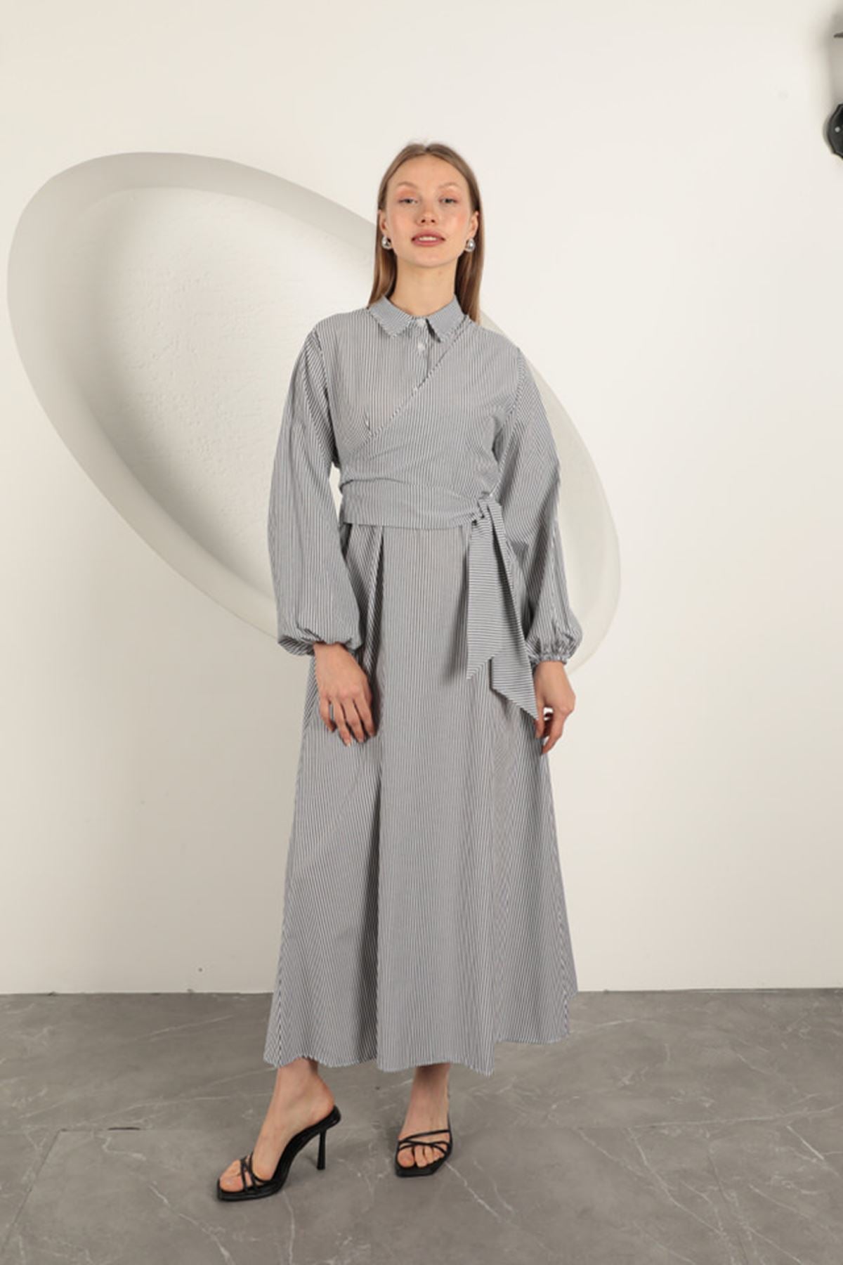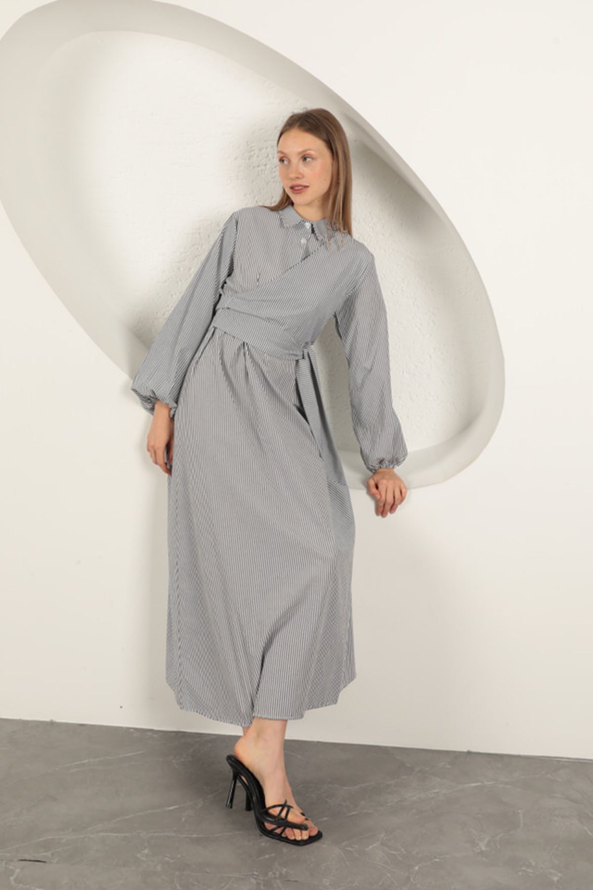 Çizgili Bağlama Detaylı Elbise-Siyah