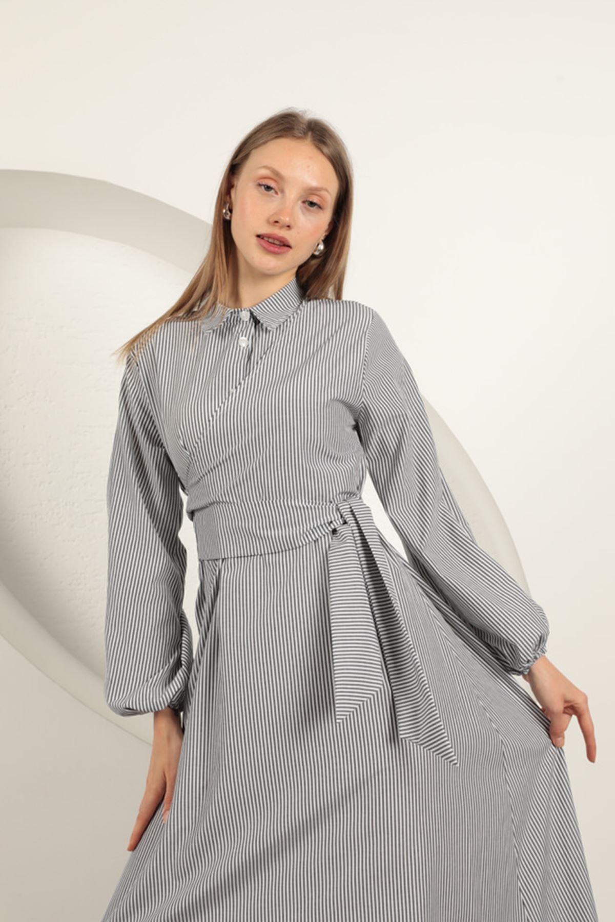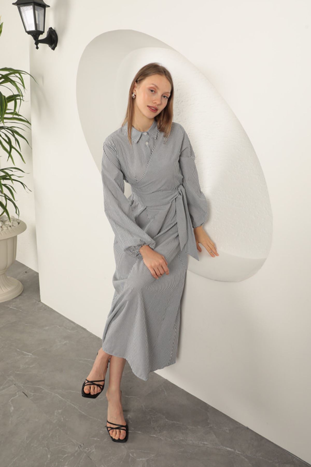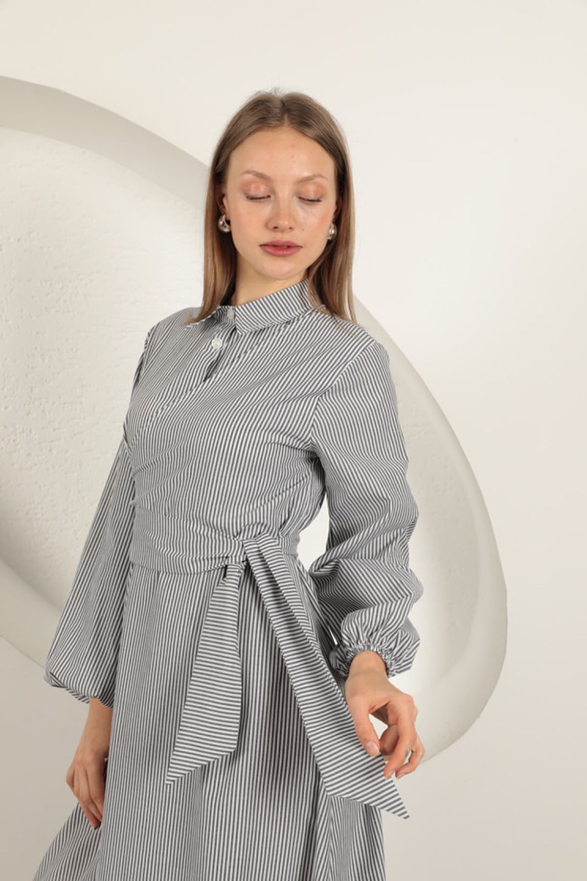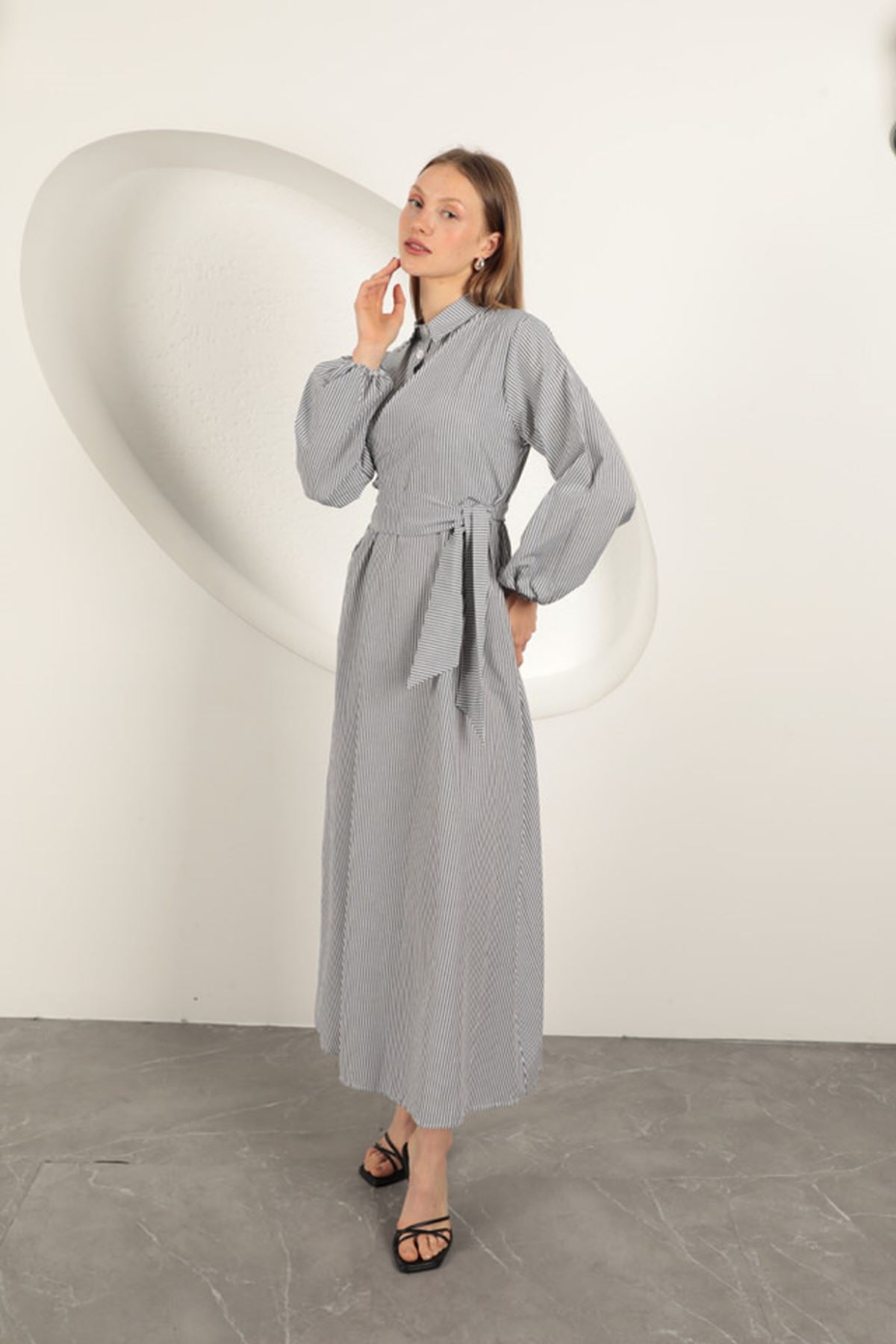 Çizgili Bağlama Detaylı Elbise-Siyah