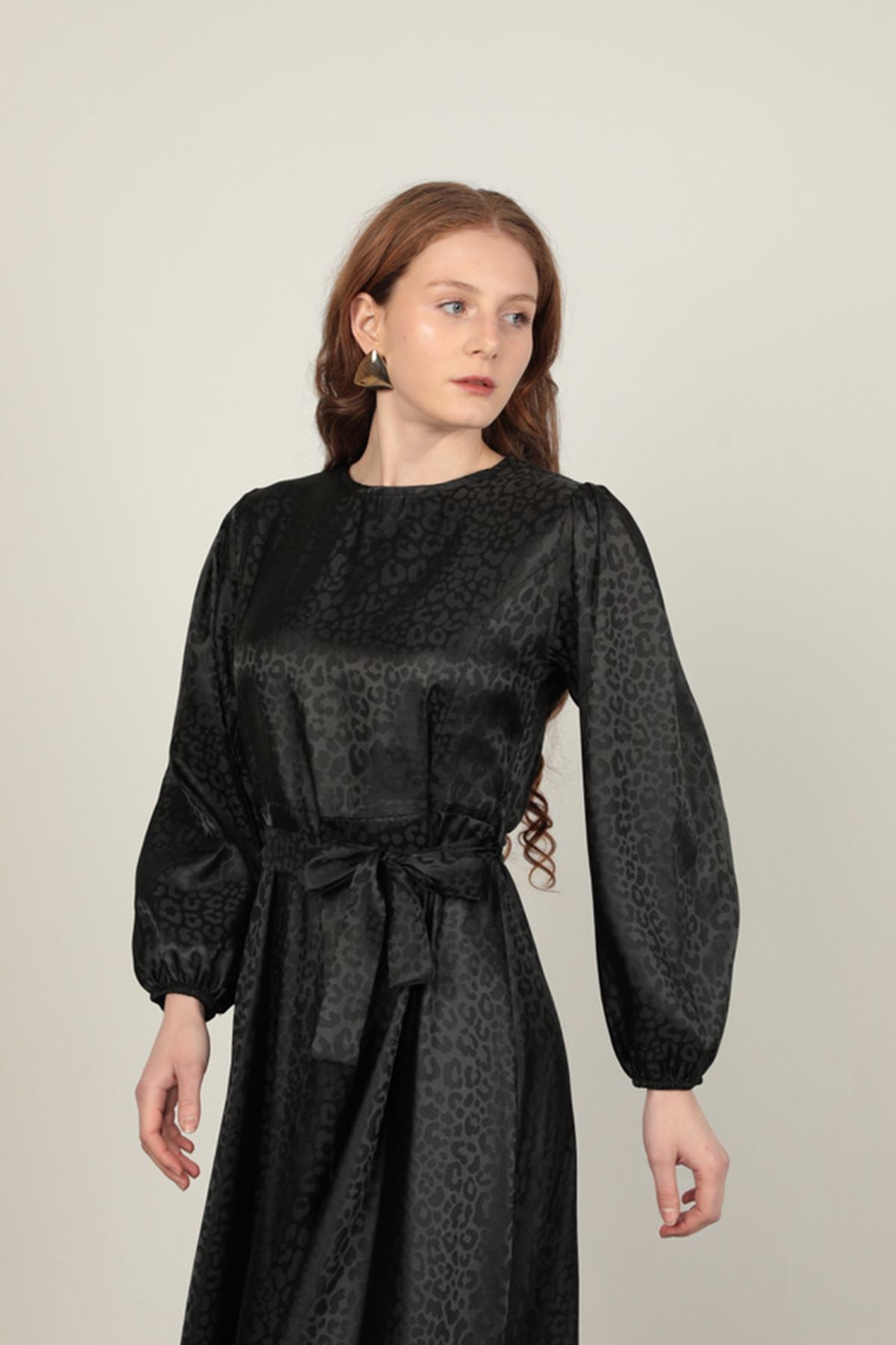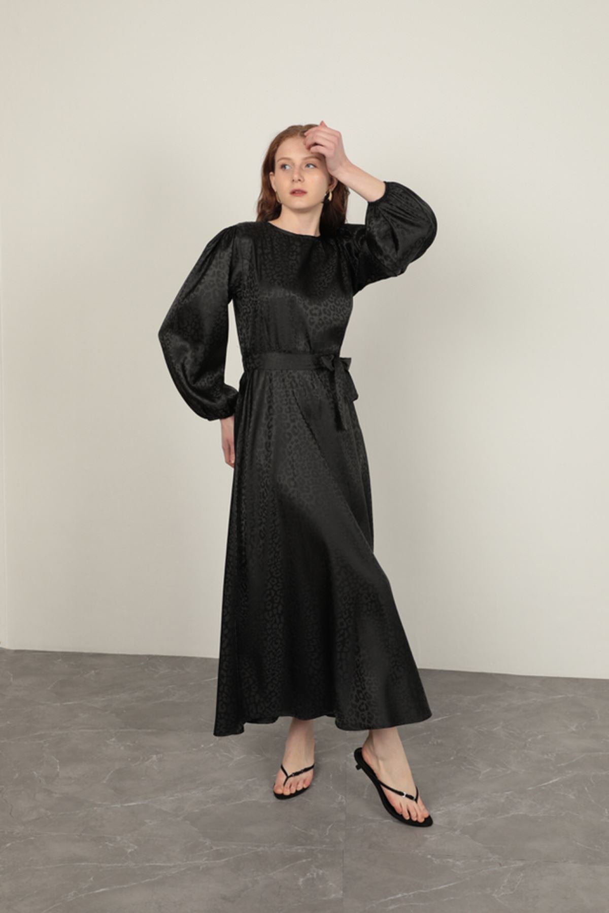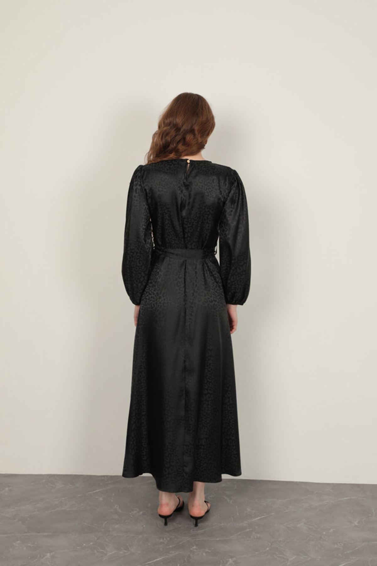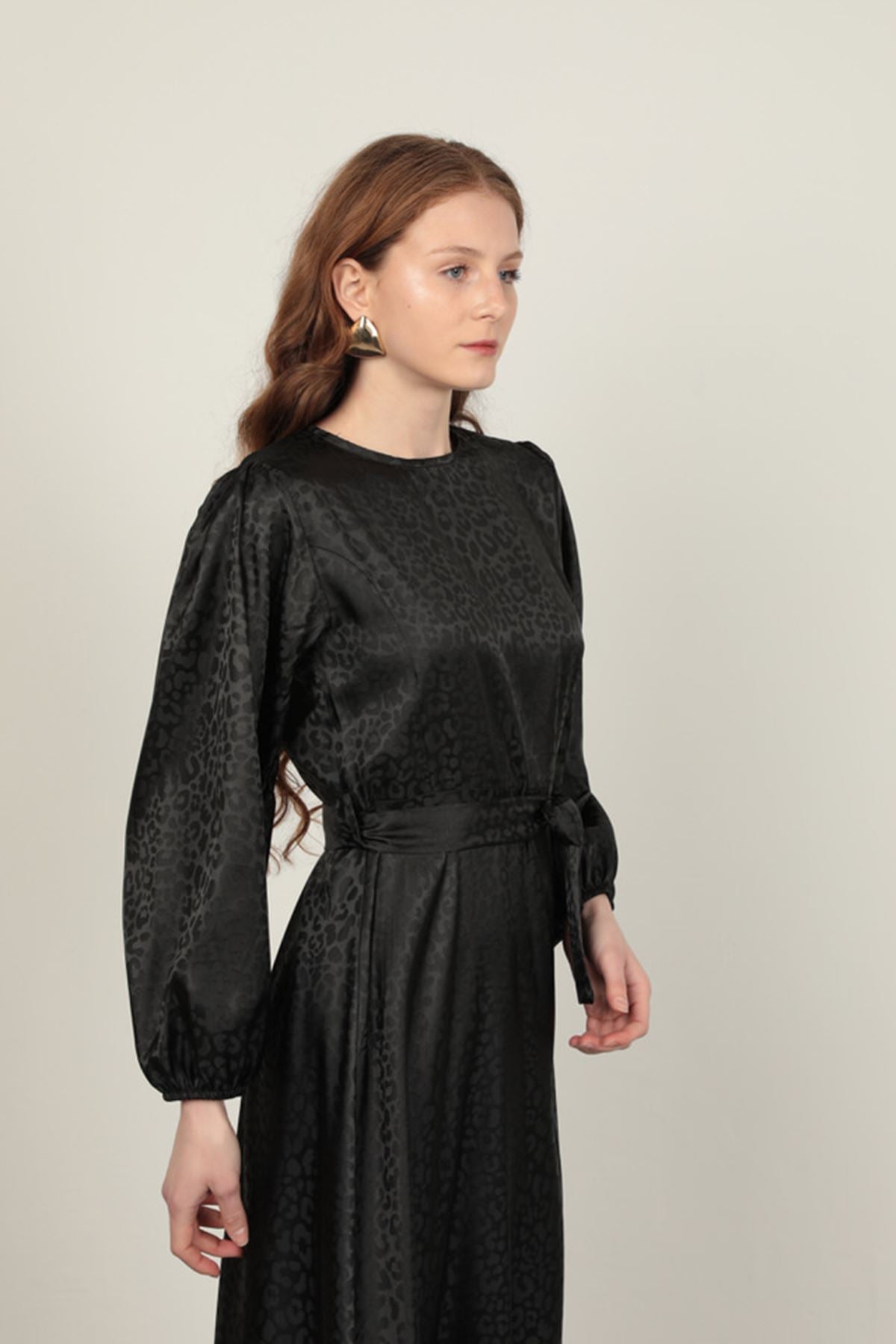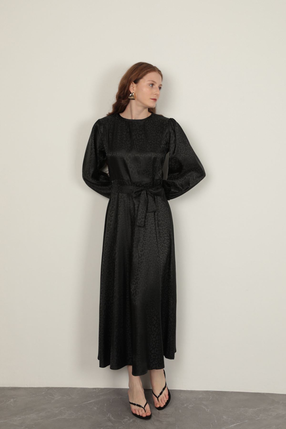Jakar Kumaş Leopar Desen Kadın Elbise-Siyah