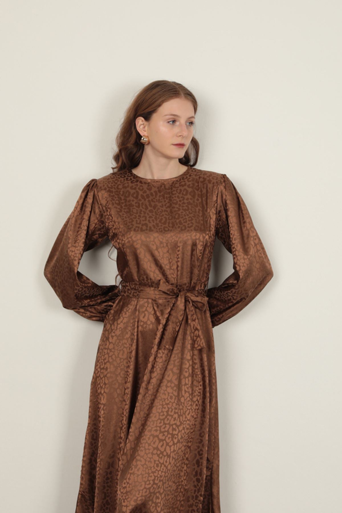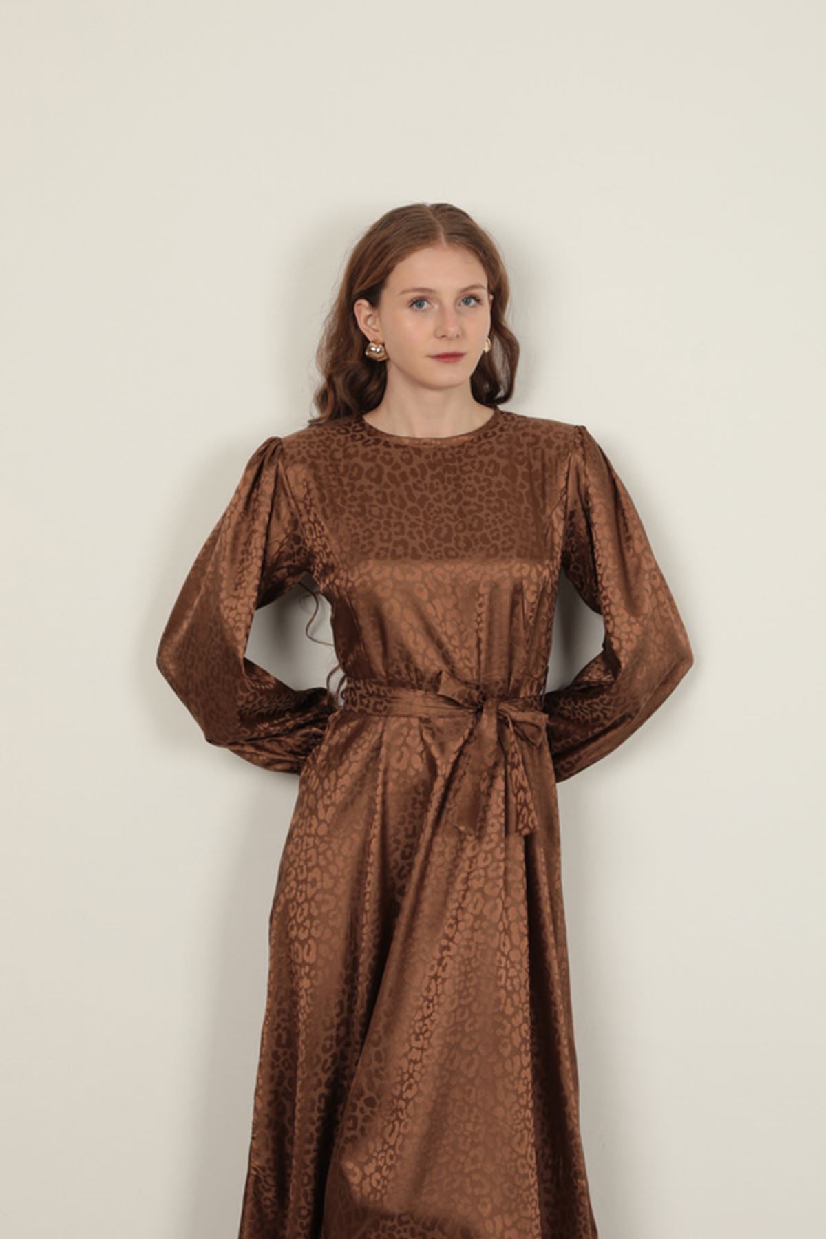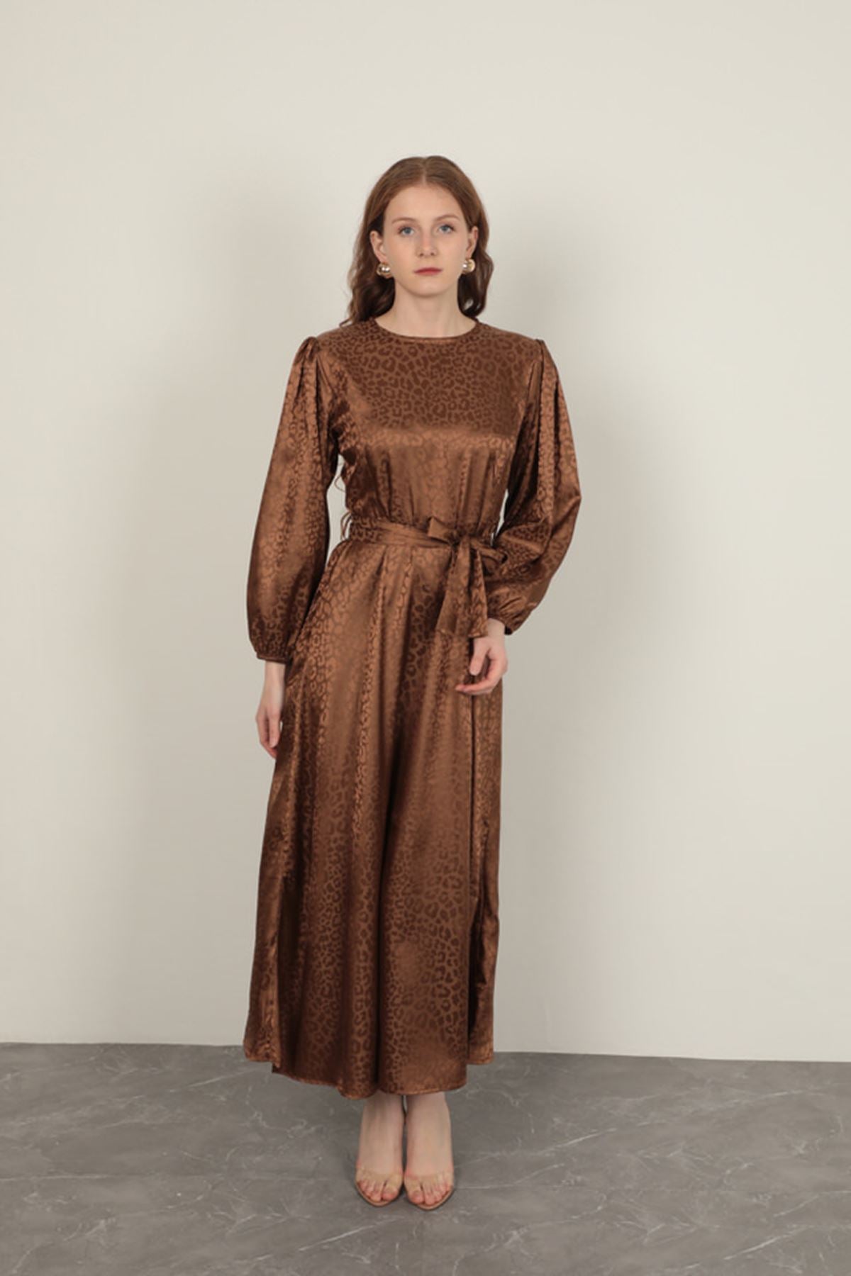 Jakar Kumaş Leopar Desen Kadın Elbise-Taba