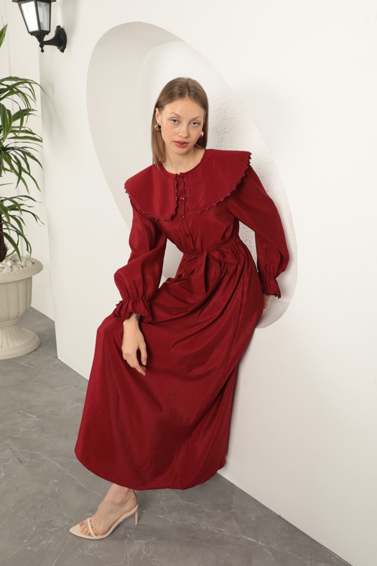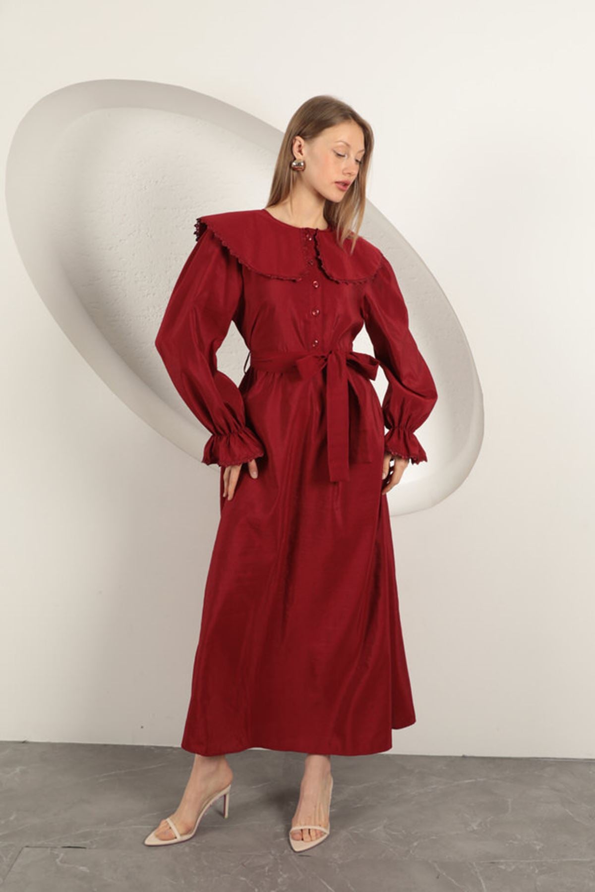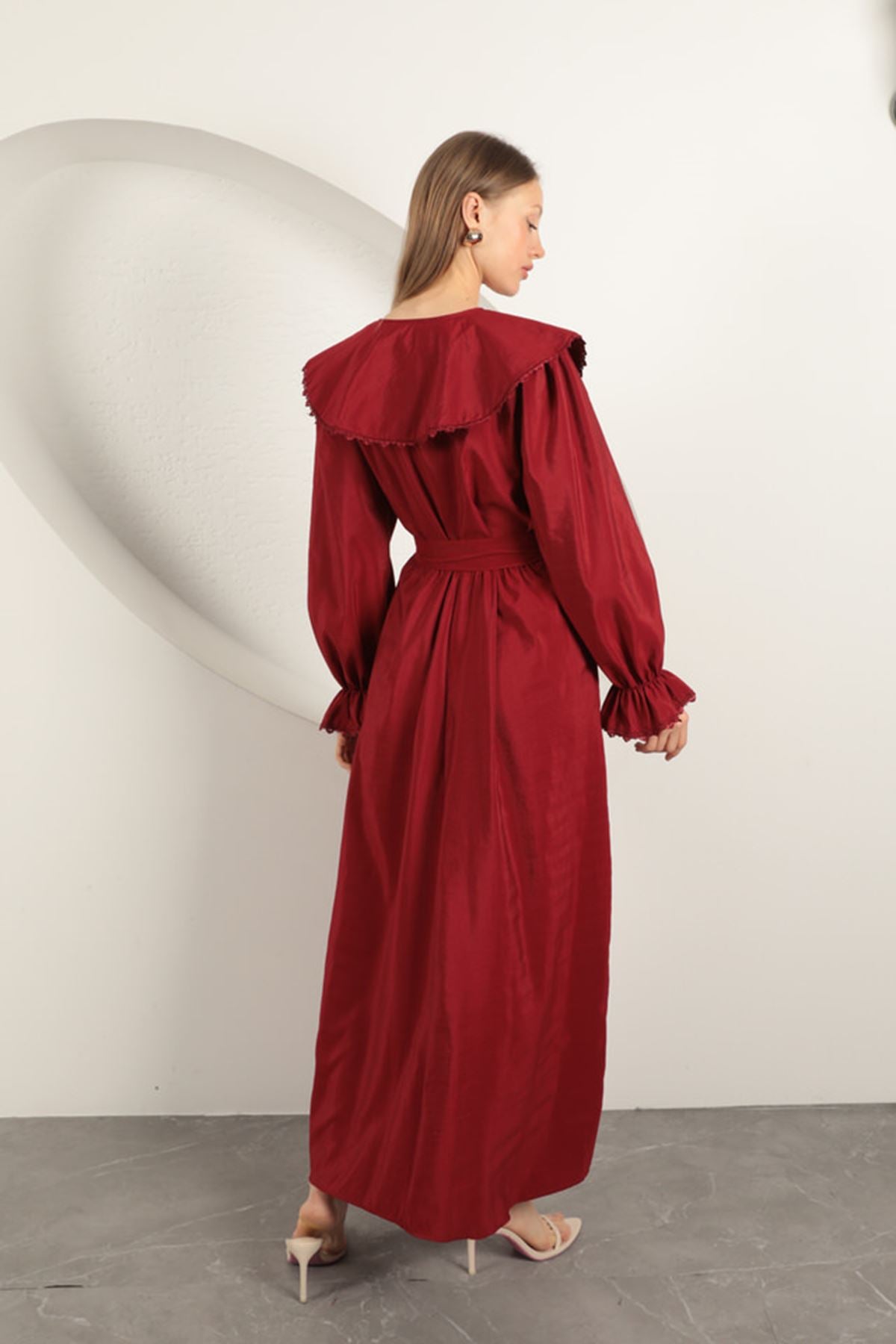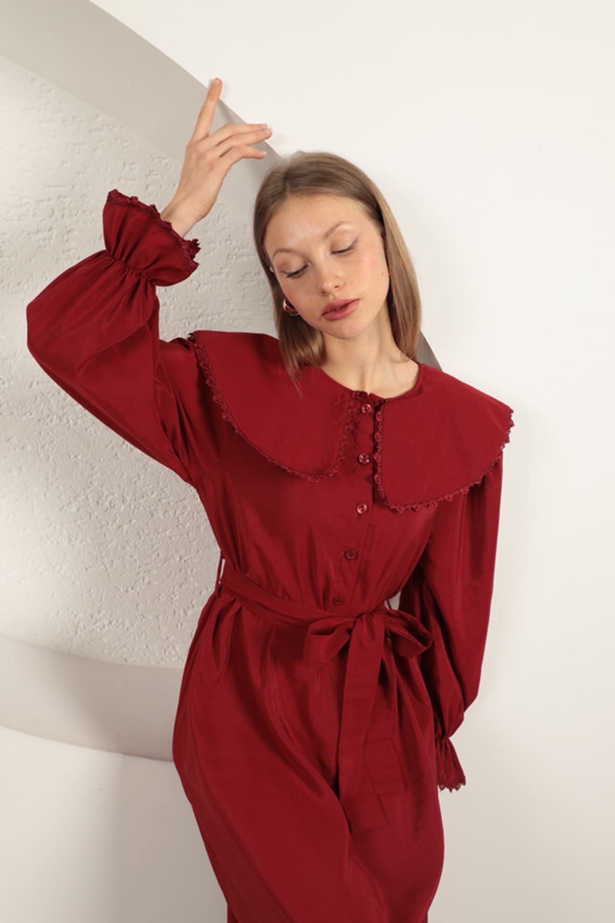 Modal Kumaş Dantelli Kadın Elbise-Bordo