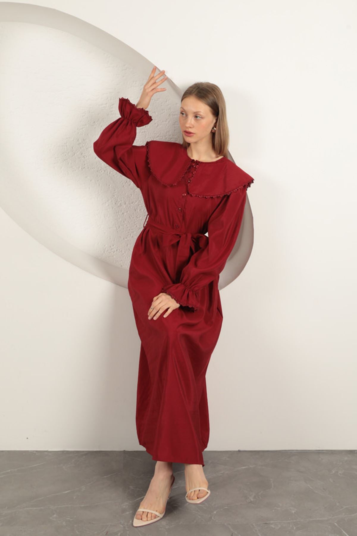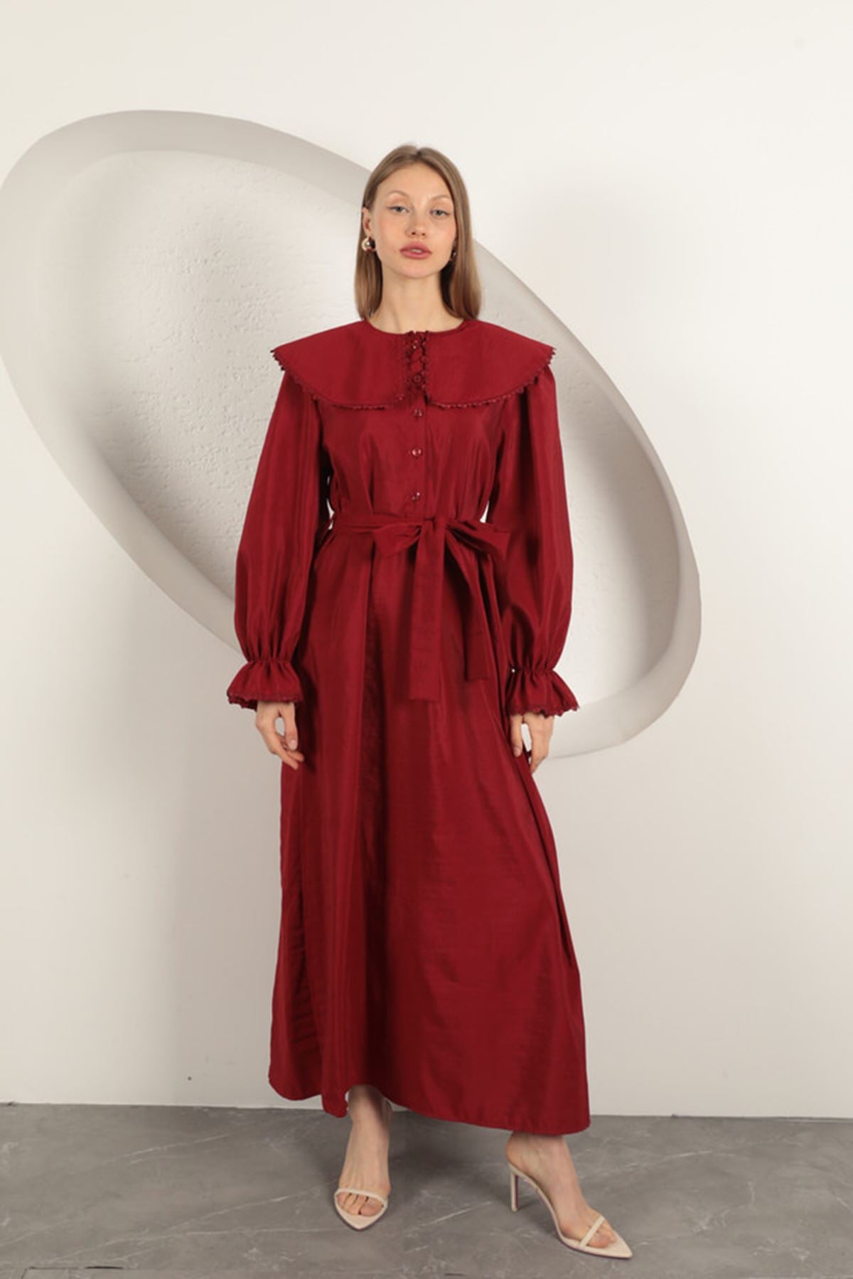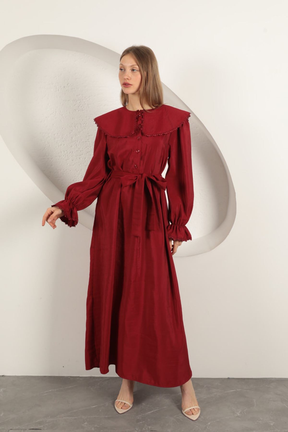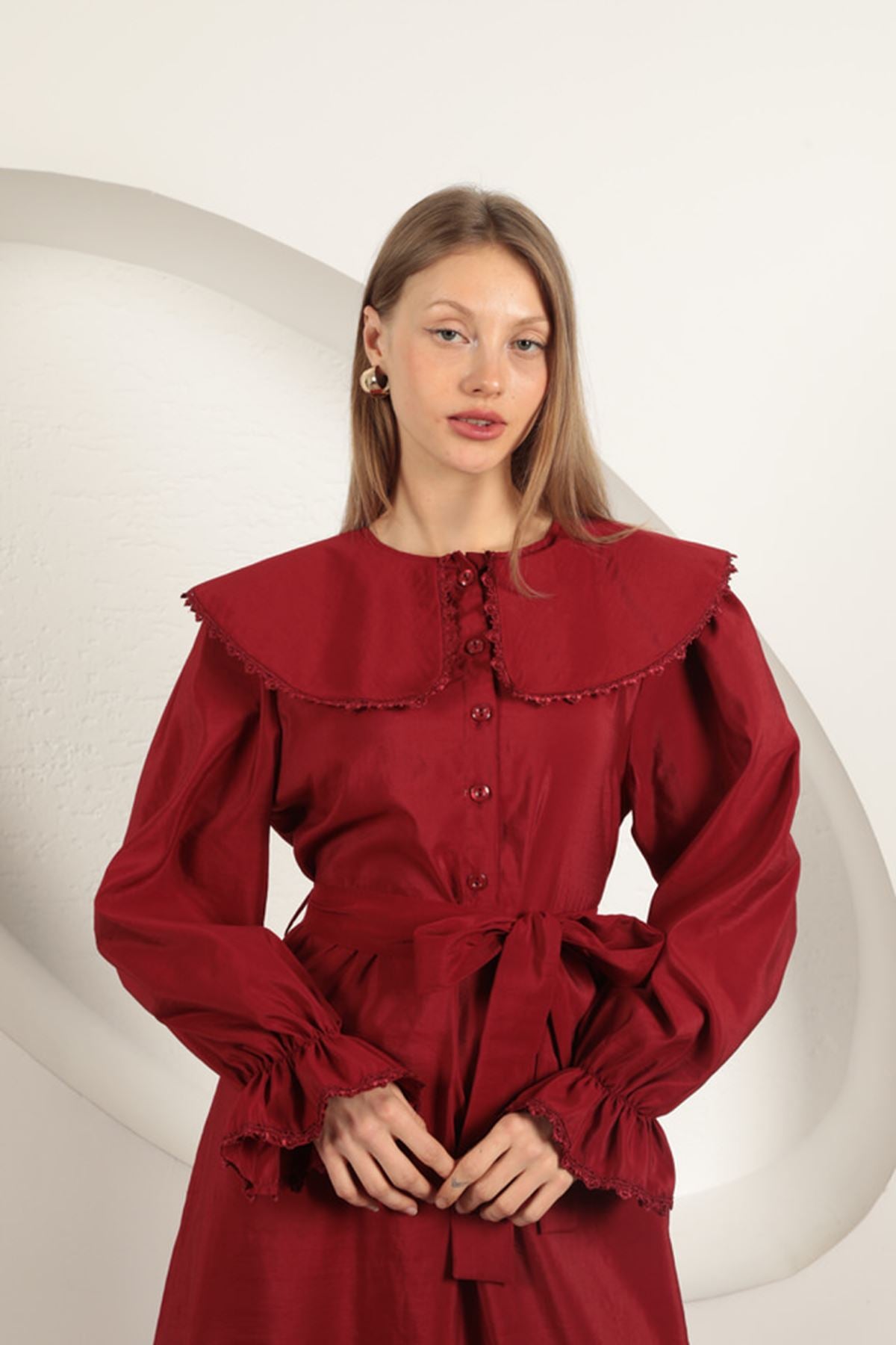 Modal Kumaş Dantelli Kadın Elbise-Bordo