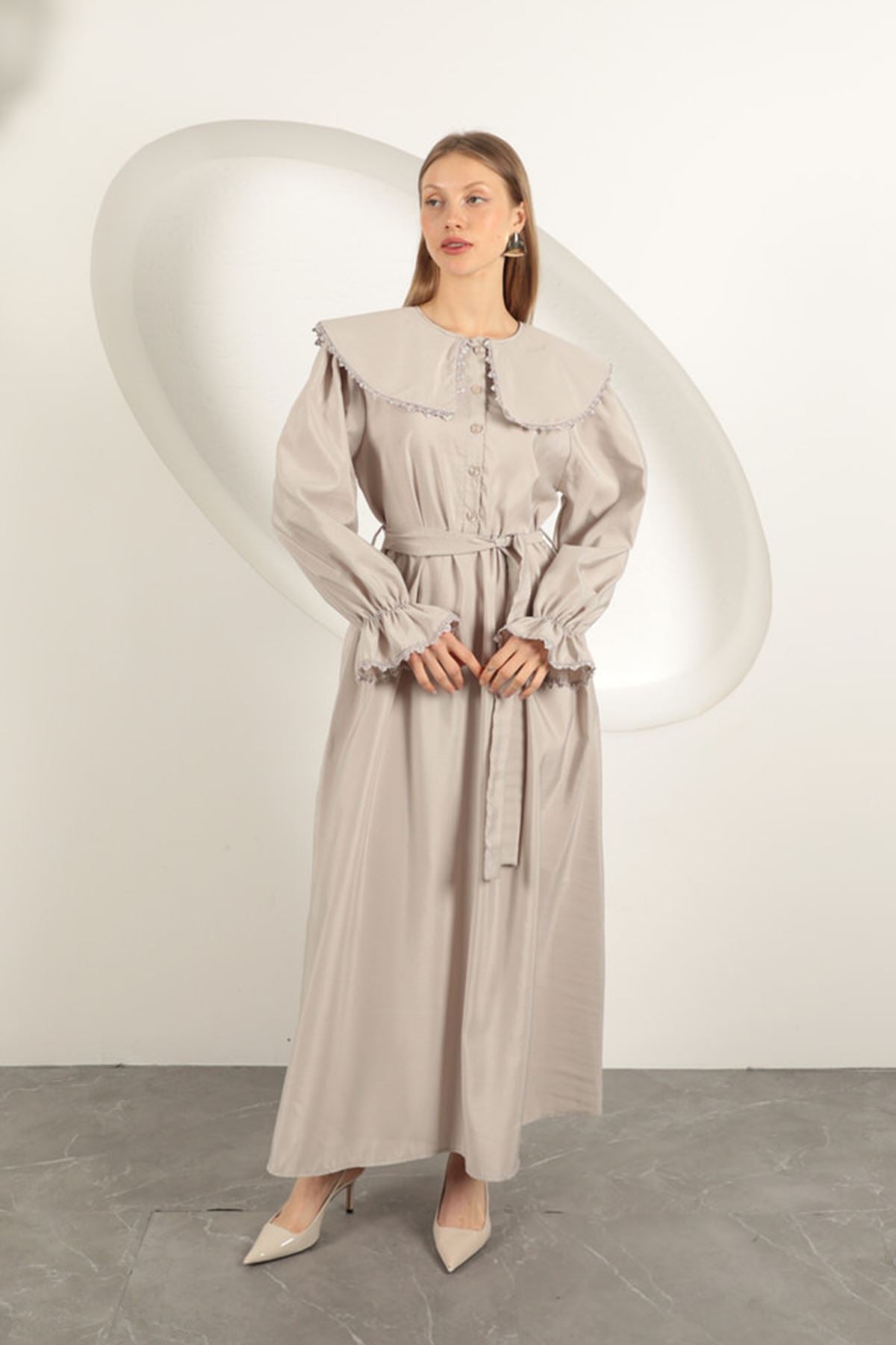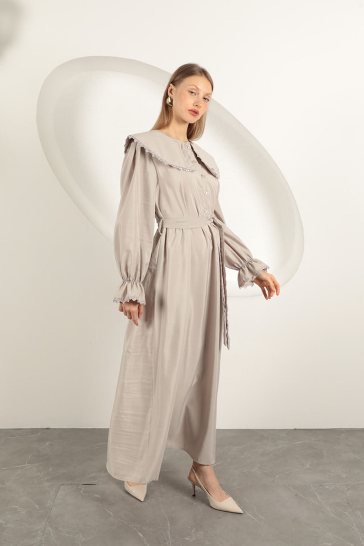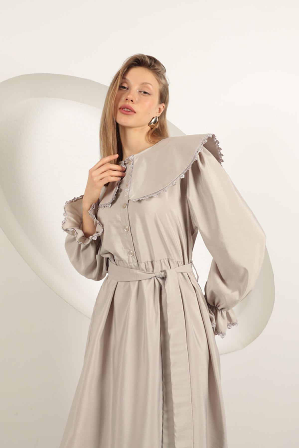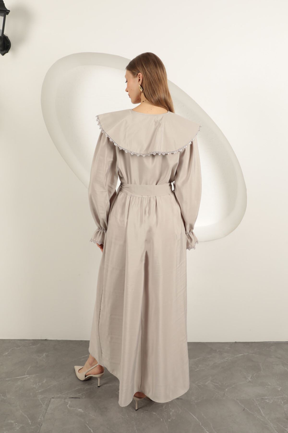 Modal Kumaş Dantelli Kadın Elbise-Taş
