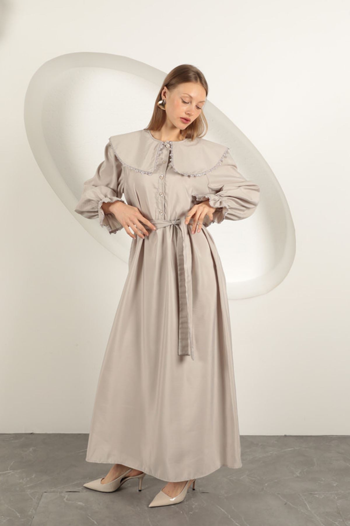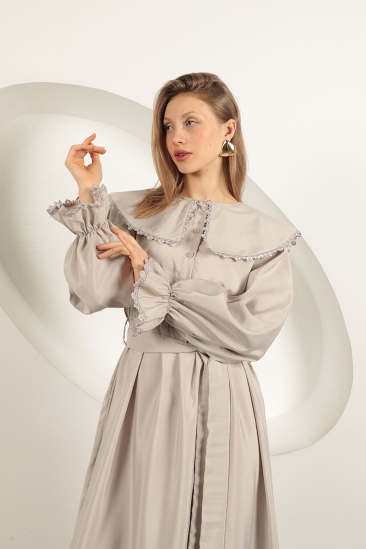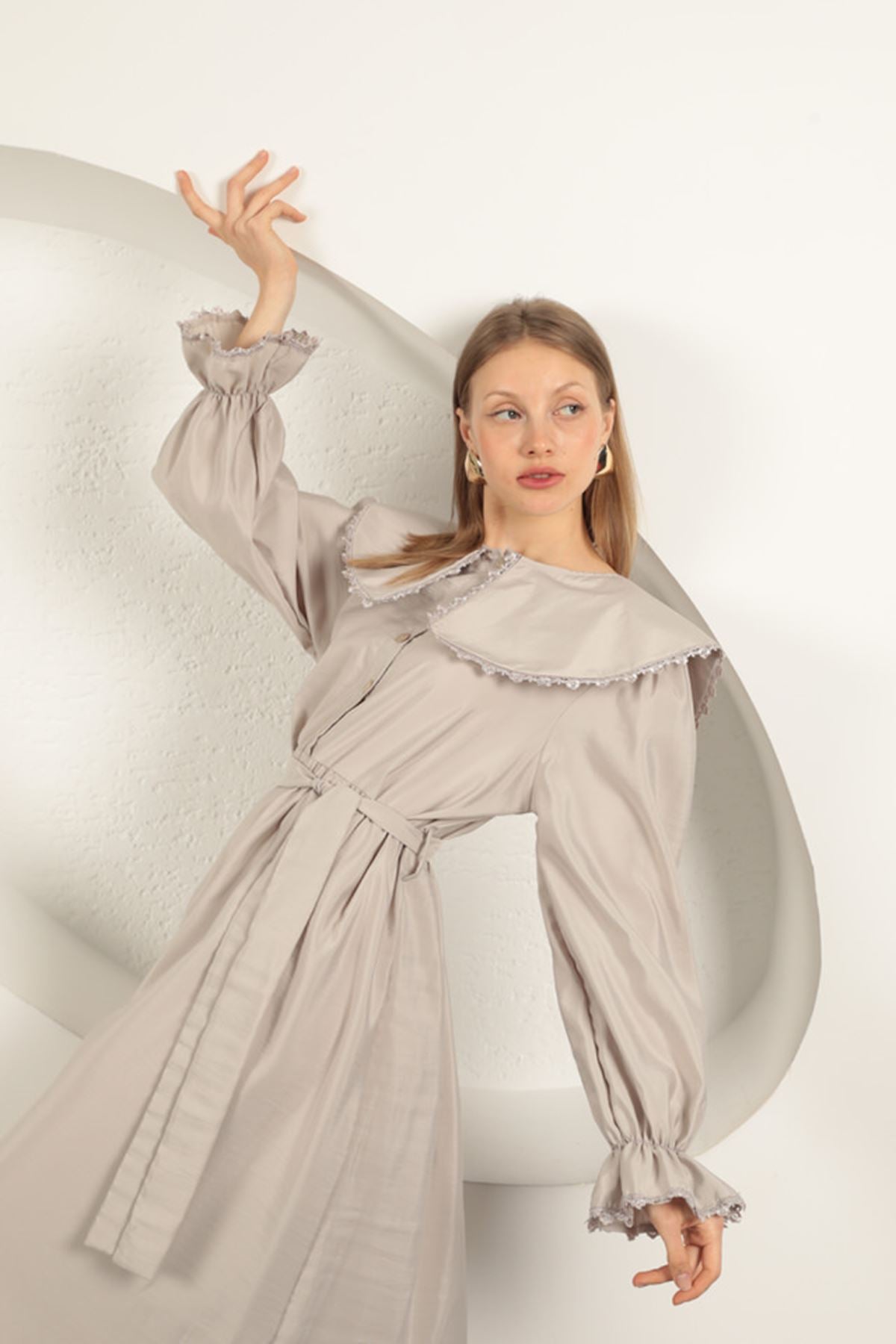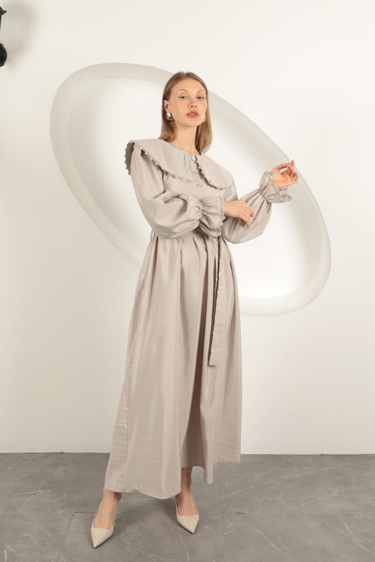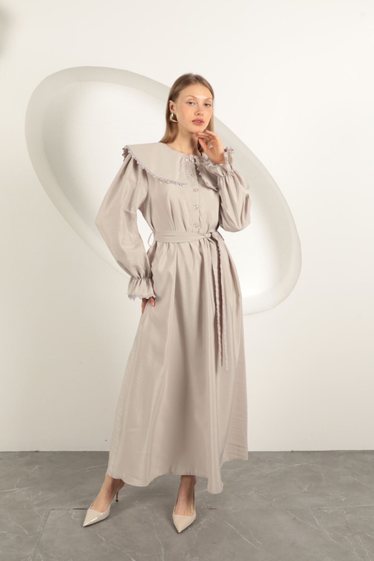 Modal Kumaş Dantelli Kadın Elbise-Taş