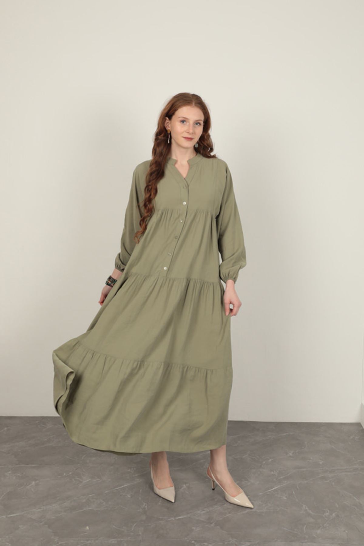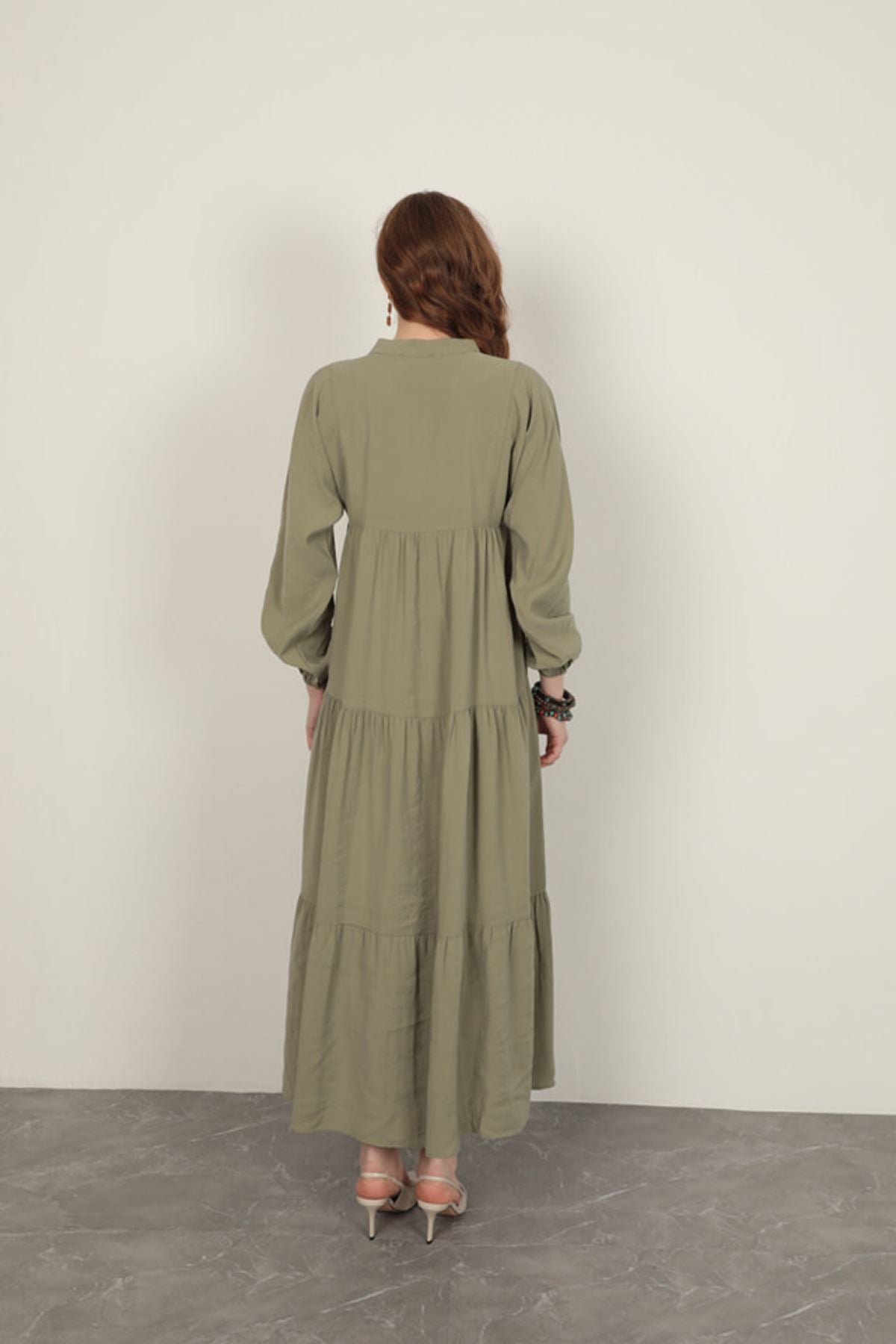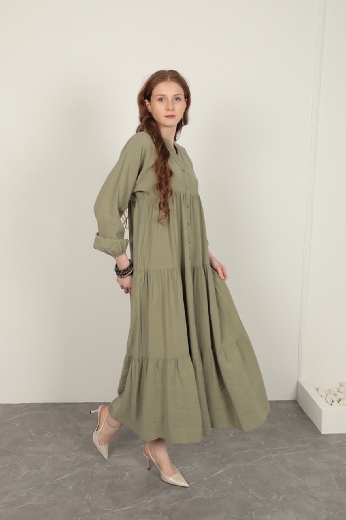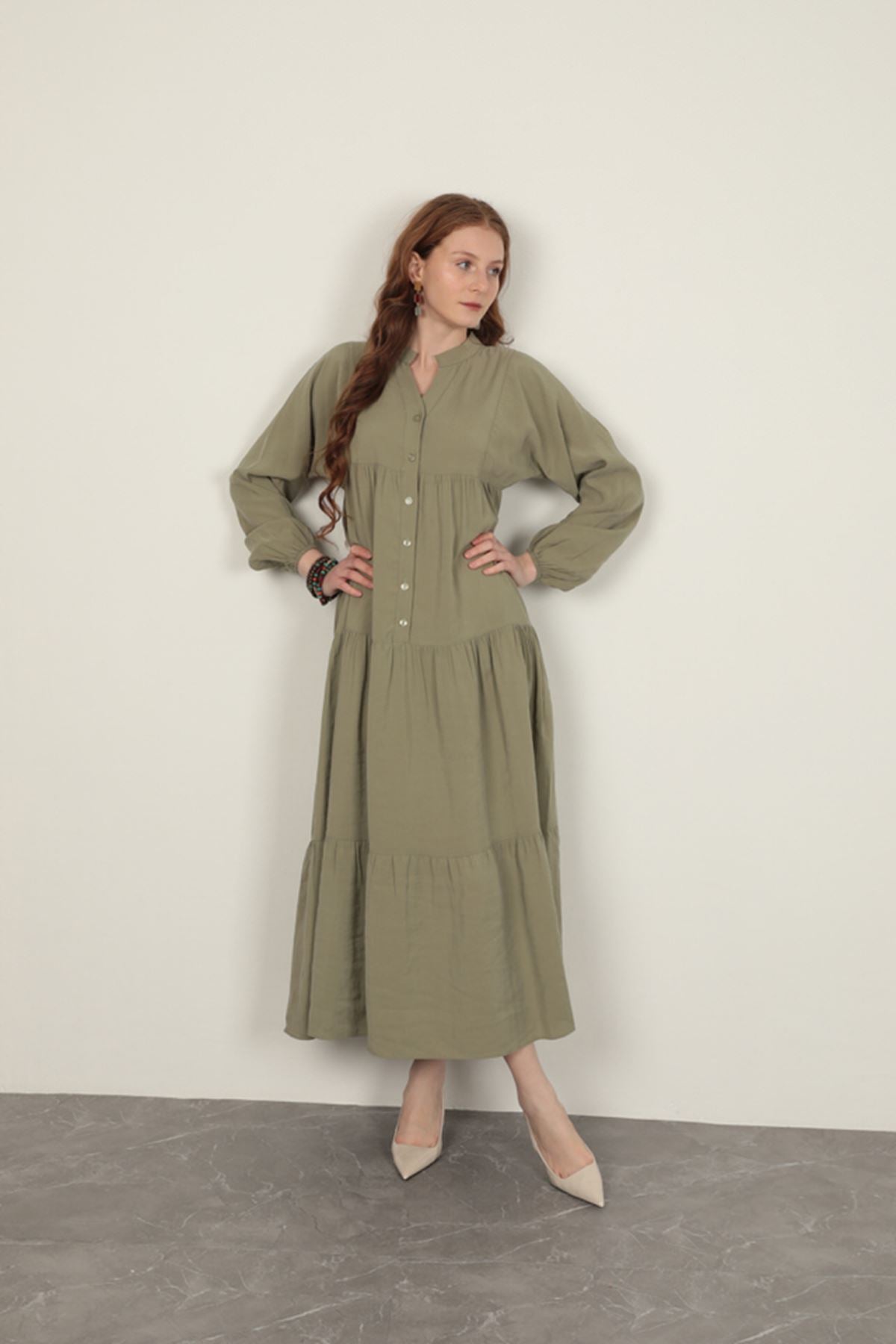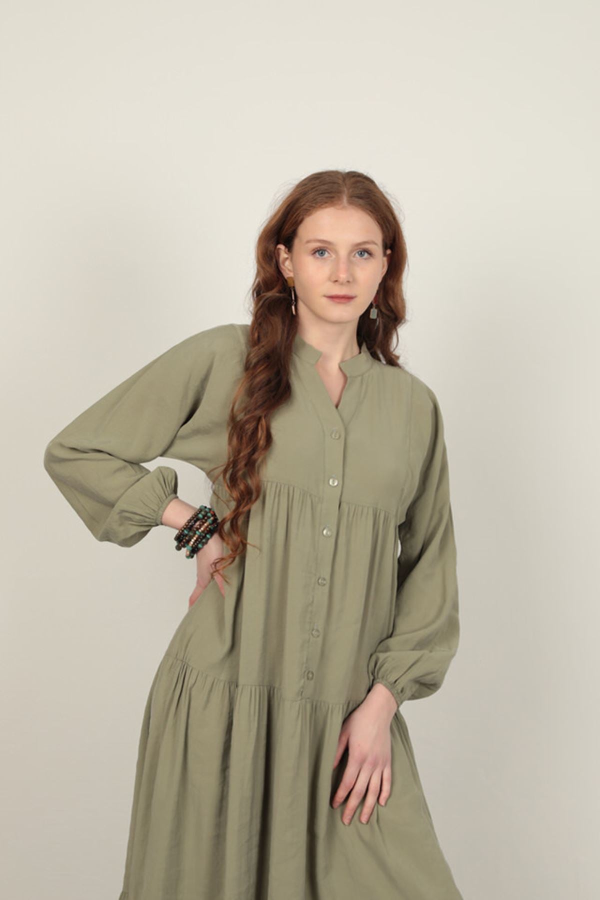 Modal Kumaş Kolu Lastikli Elbise-Açık Haki