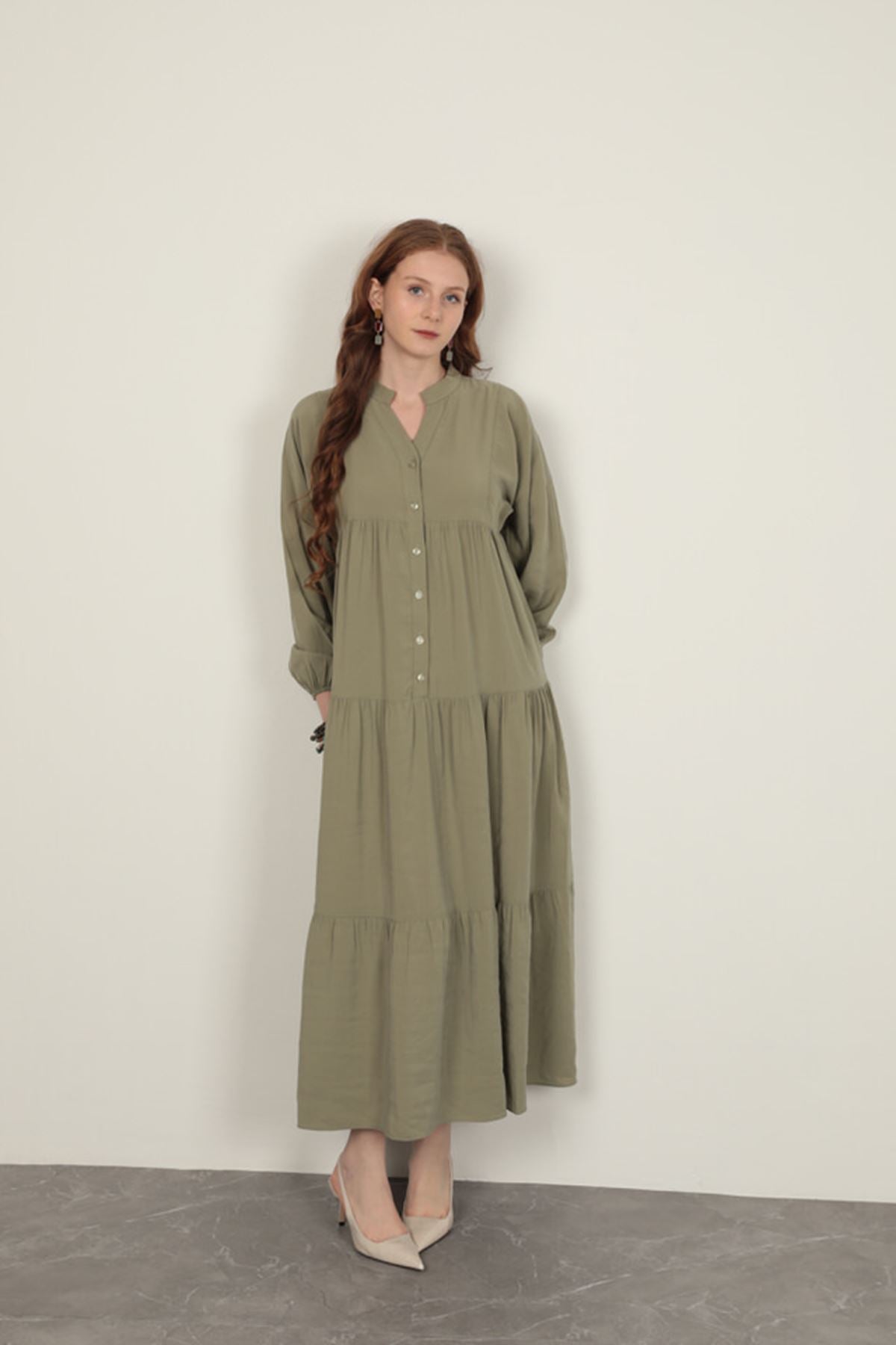 Günlük kullanım için ideal olan bu tesettür elbise, minimalist şıklık arayanlar için mükemmel bir tercihtir. Açık Haki rengiyle her kombine uyum sağlayarak şal ve aksesuarlarla tamamlanabilir. Hem rahat hem de zarif bir görünüm sunan bu model, tesettür moda trendlerine uyum sağlar.