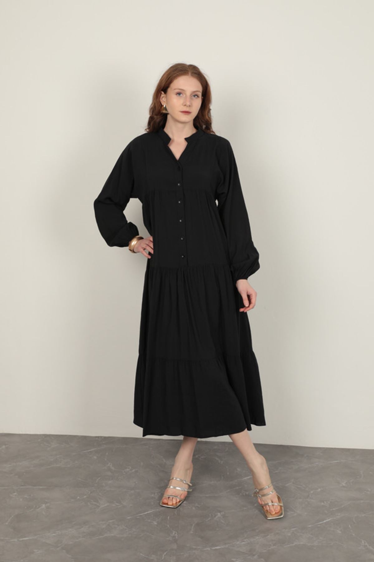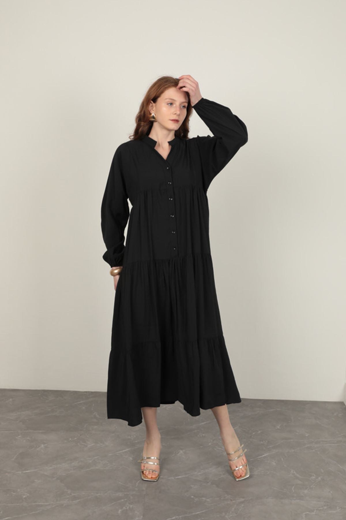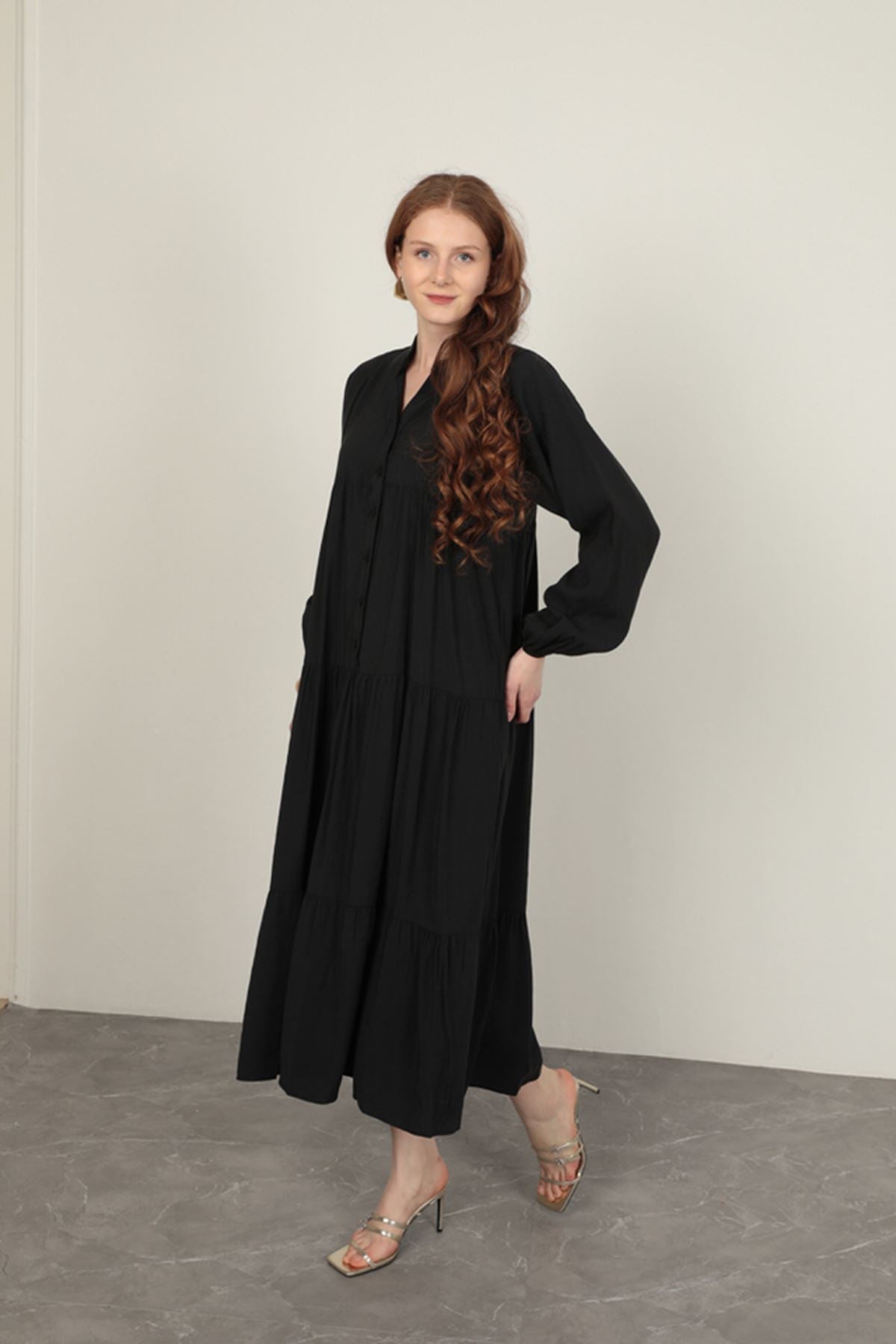 Günlük kullanım için ideal olan bu tesettür elbise, minimalist şıklık arayanlar için mükemmel bir tercihtir. Siyah rengiyle her kombine uyum sağlayarak şal ve aksesuarlarla tamamlanabilir. Hem rahat hem de zarif bir görünüm sunan bu model, tesettür moda trendlerine uyum sağlar.