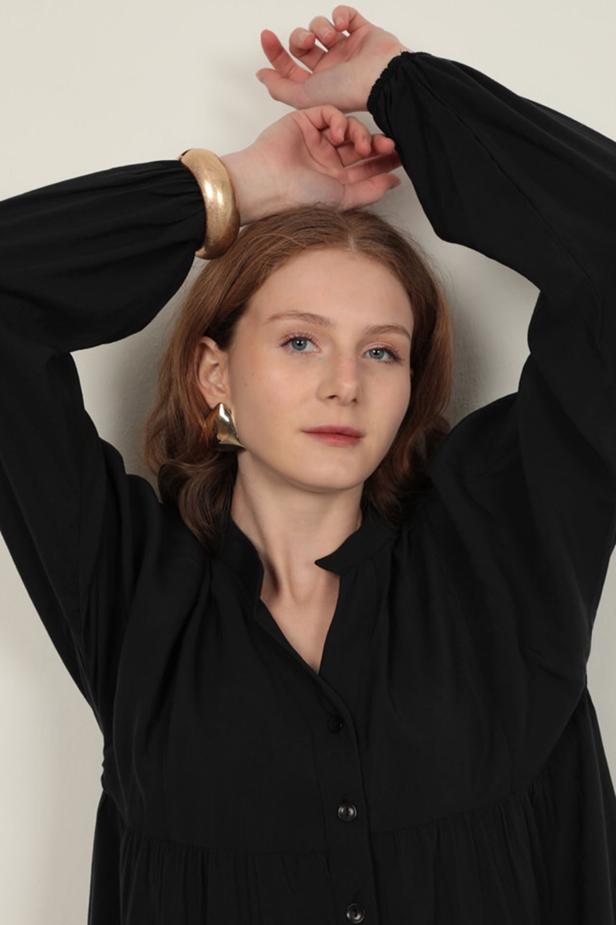 Modal Kumaş Kolu Lastikli Siyah Elbise