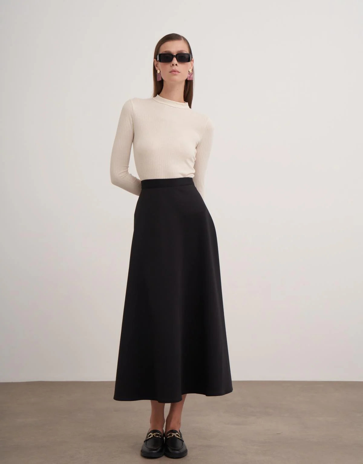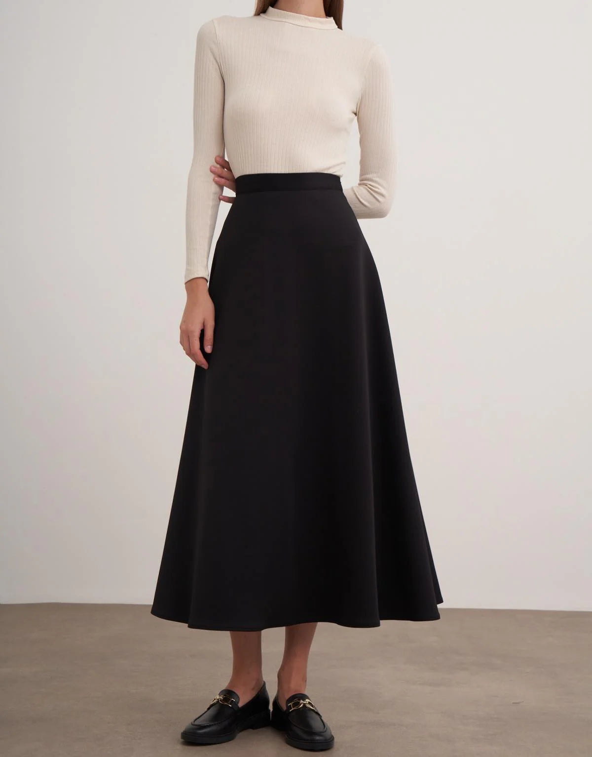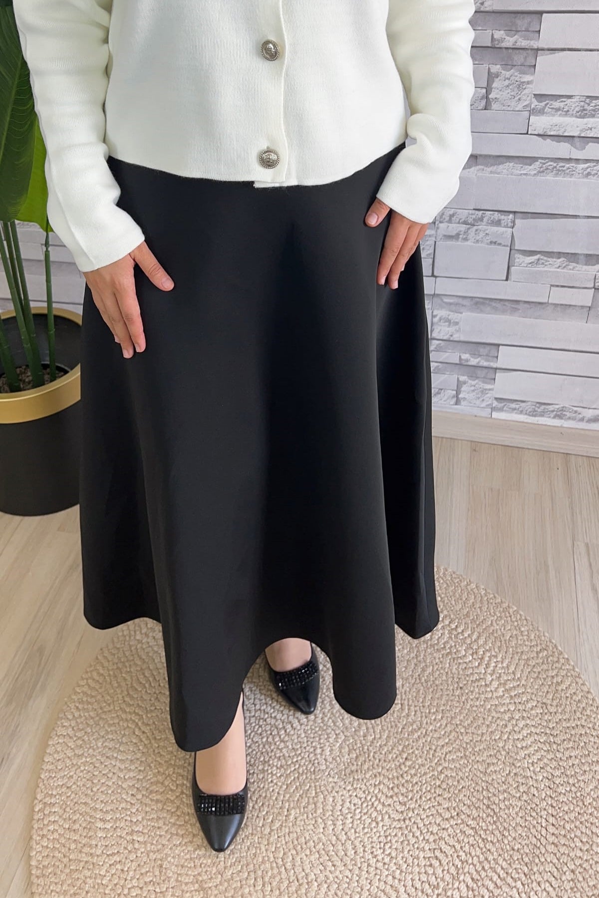 Minimalist stilin vazgeçilmezi: Siyah scuba kumaş yüksek bel kloş etek, hem konforlu hem de güçlü bir görünüm sunuyor. Tok duruşlu scuba kumaşı sayesinde formunu kaybetmeden giyilir, kloş kesimi ile her adımda zarif bir hareket yakalar.